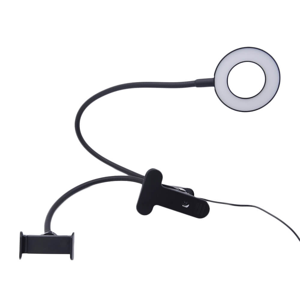Гибкий портативный светильник для съемок на смартфон. Прибор представляет собой кольцевую безбликовую лампу на светодиодах, предназначенную для улучшения качества видео и фото съемки на улице и внутри помещения. Устройство удерживается специальной прищепкой и оснащено зажимом для смартфона. Для подключения к последнему предусмотрен разъем micro USB. Переключатель на проводе позволяет выбирать различные режимы освещения и яркость. Мощность лампы 5 Вт.